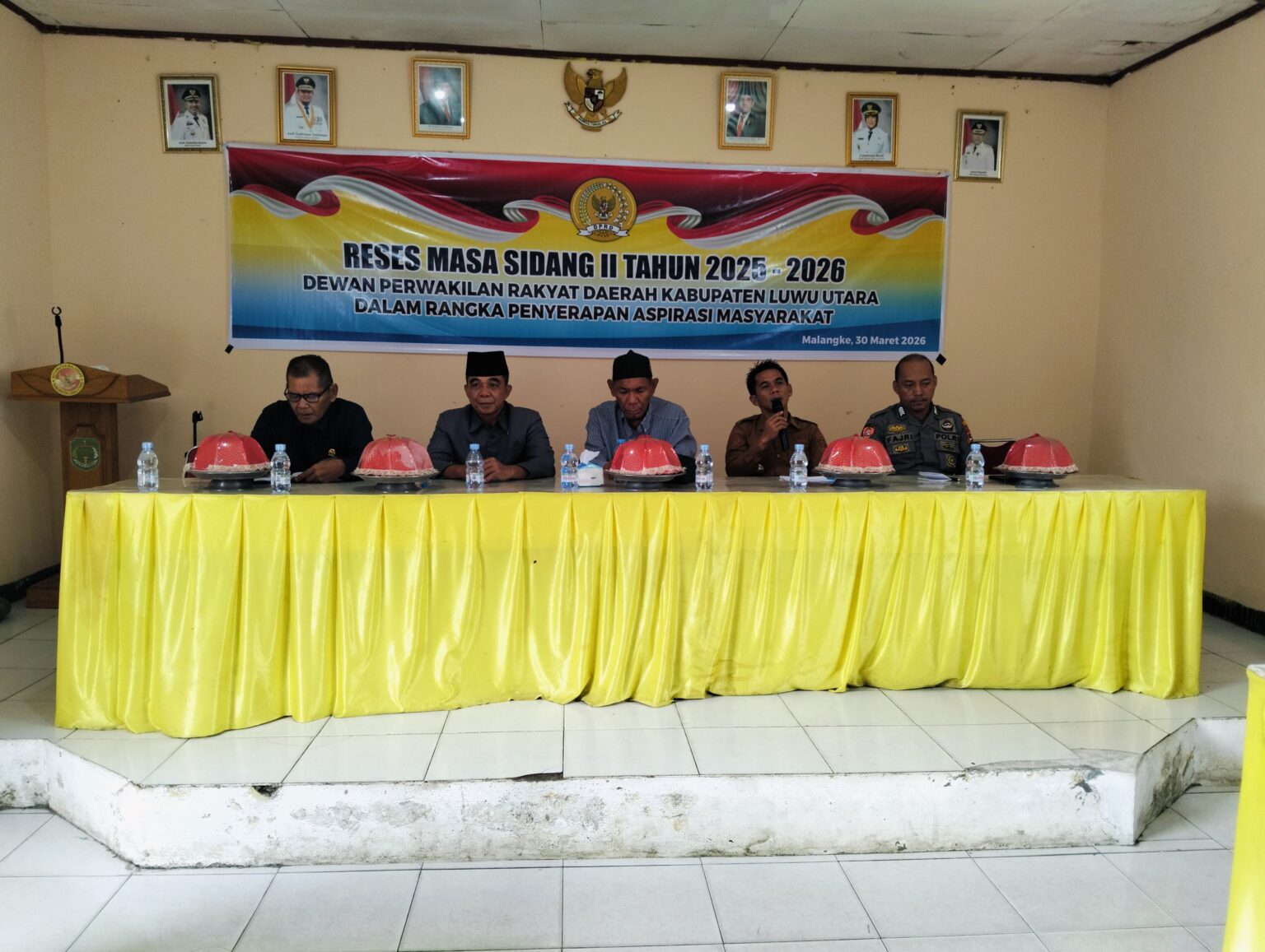 Dalam upaya memperjuangkan kebutuhan masyarakat di daerah pemilihan, DPRD Luwu Utara melaksanakan reses di Aula Kantor Camat Malangke, Desa Tolada, Senin (30/3/2026).